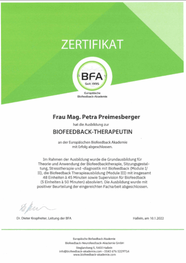 - Durch diese Rückmeldung kann der Klient lernen, seine Körpervorgänge zu beeinflussen und zu kontrollieren.